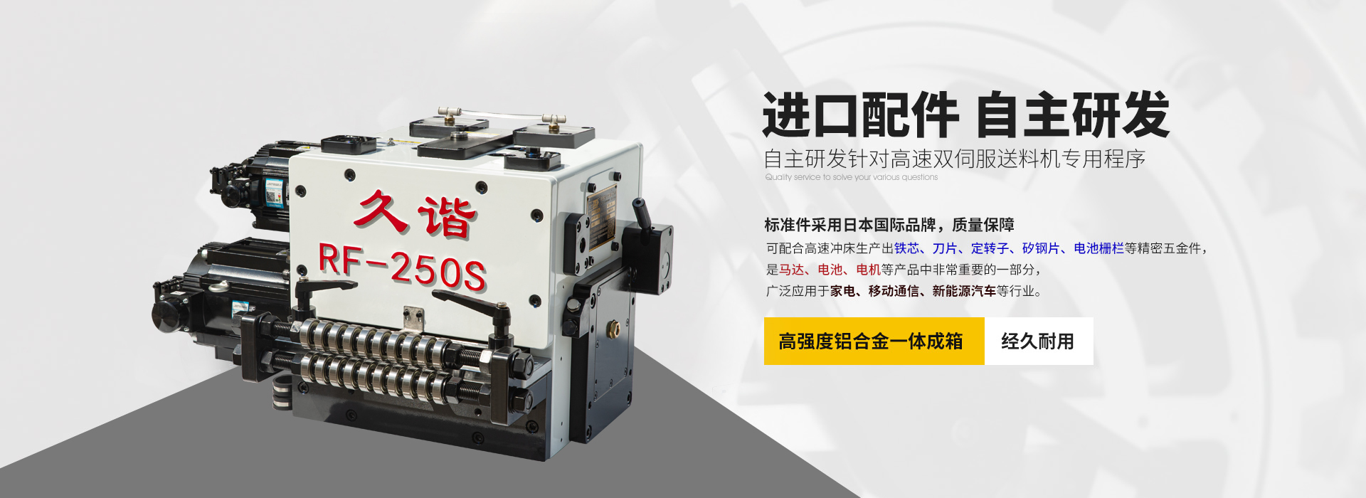 東莞市久諧自動化設備有限公司位于享譽國際的制造業名城——廣東東莞,是一家集研發、設計、制造、銷售、維修改造進口沖床送料機為一體的現代化、高科技、高精密的沖床周邊自動化設備的技術企業。